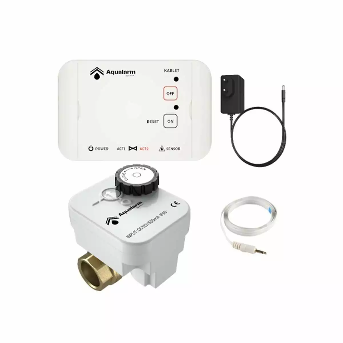 Kablet lekkasjestopper som inkluderer én hovedenhet, aktuatorventil, én sensorkabel på 3 meter med lim, én sensorenhet og strømadapter.