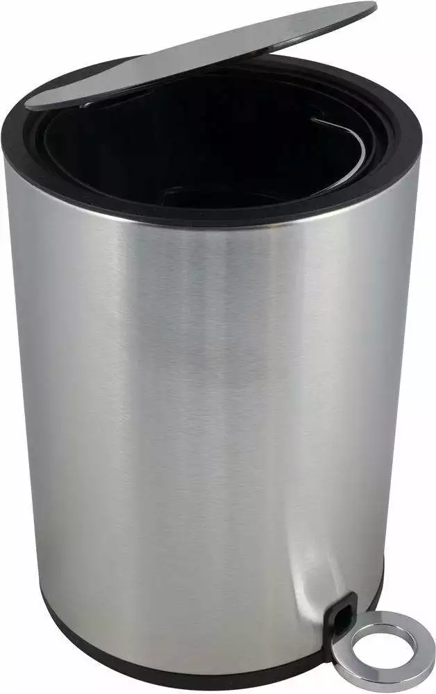 Pedalbøtte med dempet lukking av lokket. Håndtak som kan trekkes ut og skyves inn. Med løs, innvendig bøtte i svart plast og bærehanke.