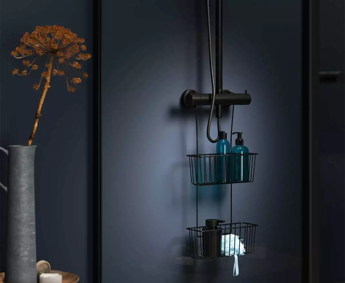 Praktisk dobbel dusjkurv for enkel organisering av dusjprodukter. Enkel montering hvor kurven festes på dusjbatteriet. Tilgjengelig i flere farger, Finnes også i enkel med én dusjkurv.
