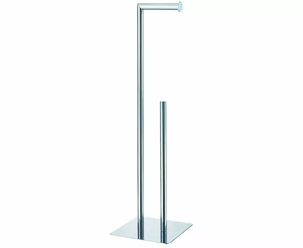 Frittstående toalettpapir- og reserverullholder med firkantet fot. Utførelse i forkrommet stål.