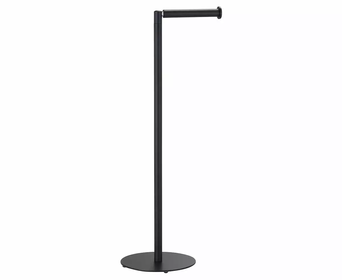Frittstående toalett- og reserverullholder med rund fot. Finnes i to forskjellige utførelser.