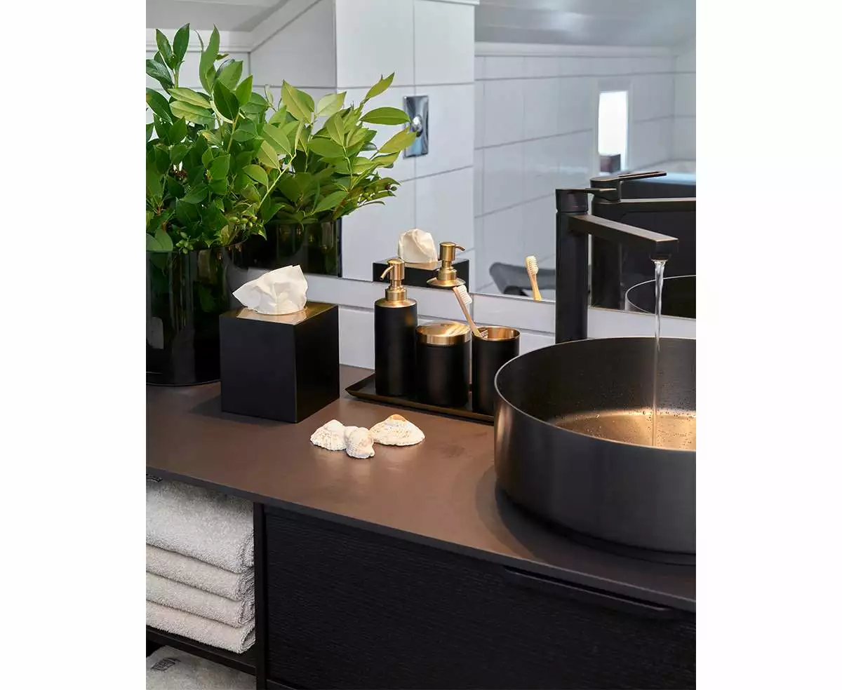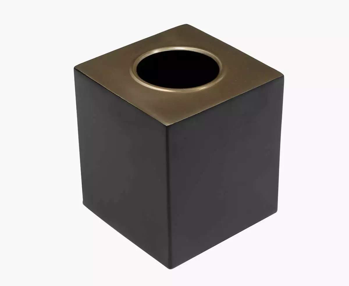 Papirdispenser i sort metall med overside i matt gull. Kombinasjonen av det mørke og gylne etterlater et sofistikert uttrykk. 12x12x13,5 cm.