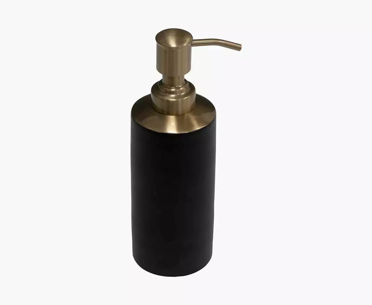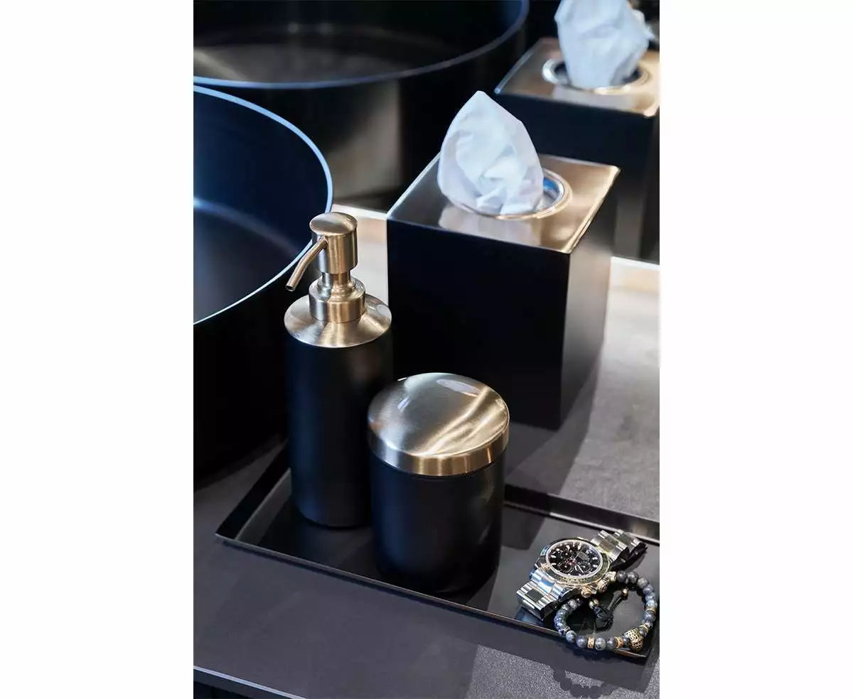 Såpedispenser i sort med matt gull overside. Kombinasjonen av det mørke og gylne etterlater et sofistikert uttrykk. 6,5×18,5 cm.