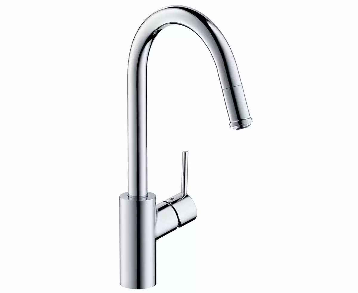 Kjøkkenarmatur med uttrekkbar tut og 1-grep med 150° svingtut som kan trekkes ut opptil 50 cm. Installasjon foran vindu mulig, armatur kan legges flatt.
