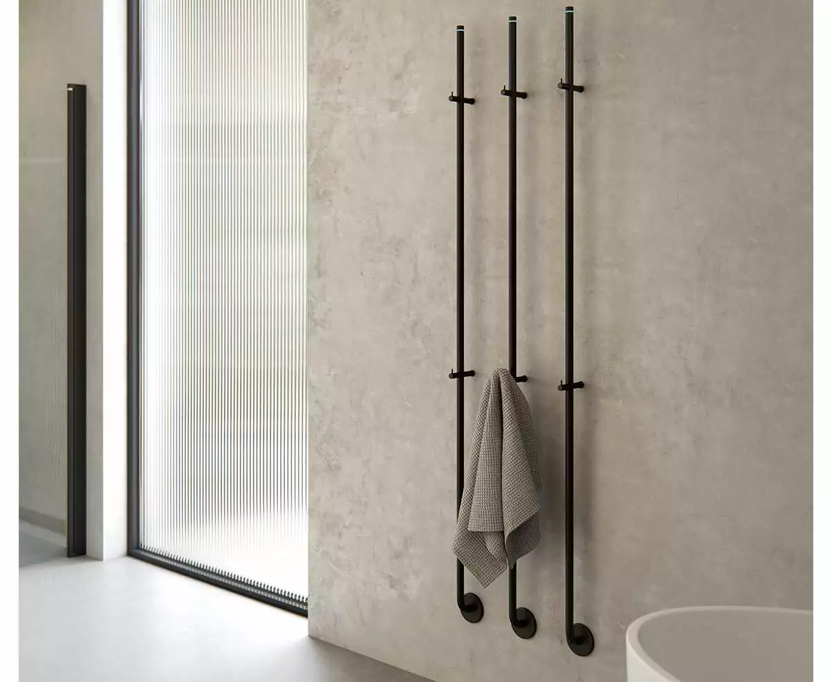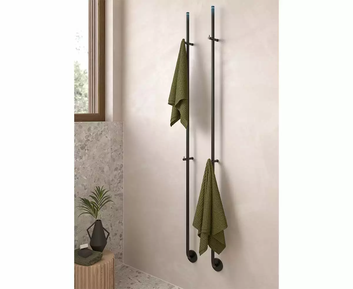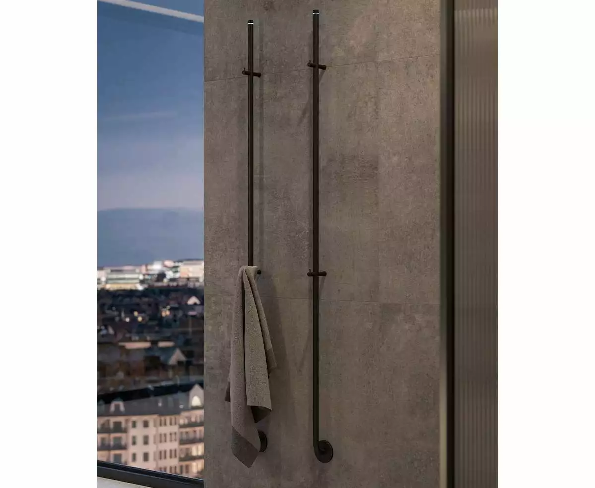 Stilren håndkletørker i sort matt med knapp på toppen for aktivering av varme og behagelig lys. Stilren og moderne som passer inn til de aller fleste baderom.