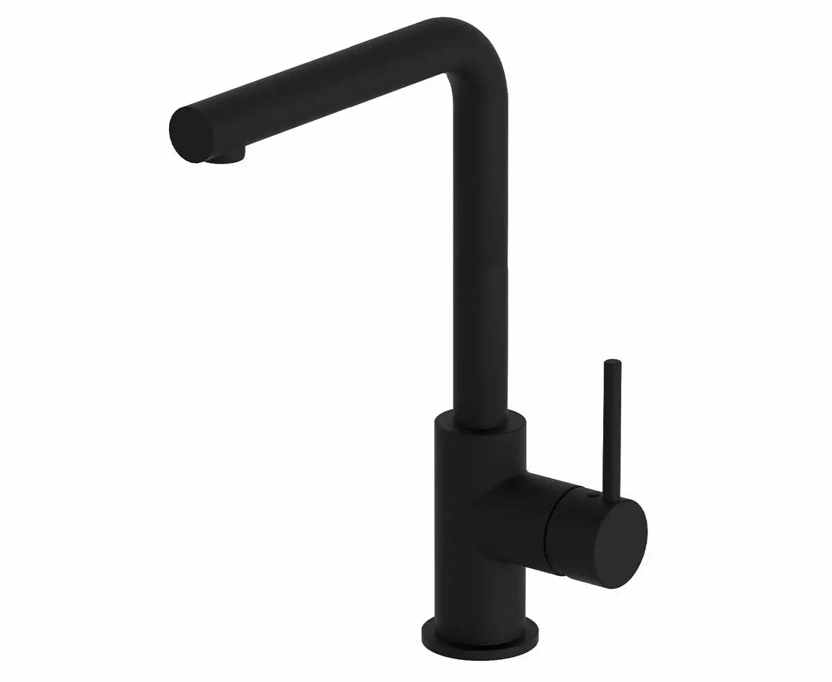 Kjøkkenkran med ettgreps betjening med svingbar tut og fleksible slanger. L-formet tut. Solid og driftssikkert i et slankt og moderne design. Velg mellom krom og sort matt.