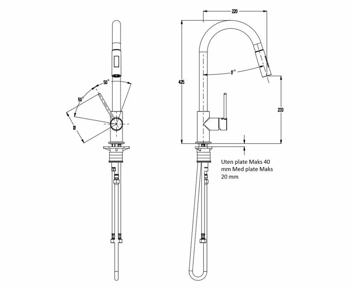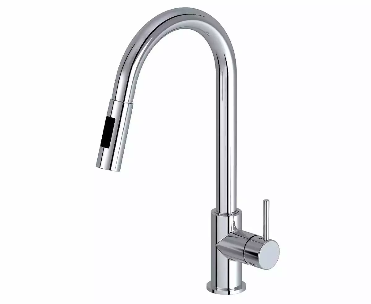 Kjøkkenkran med ettgreps betjening med uttrekkbar tut og ekstra knapp for spylefunksjon. Høy rund dreibar tut. Fleksible slanger for enkel tilkobling. Velg mellom krom og sort matt.