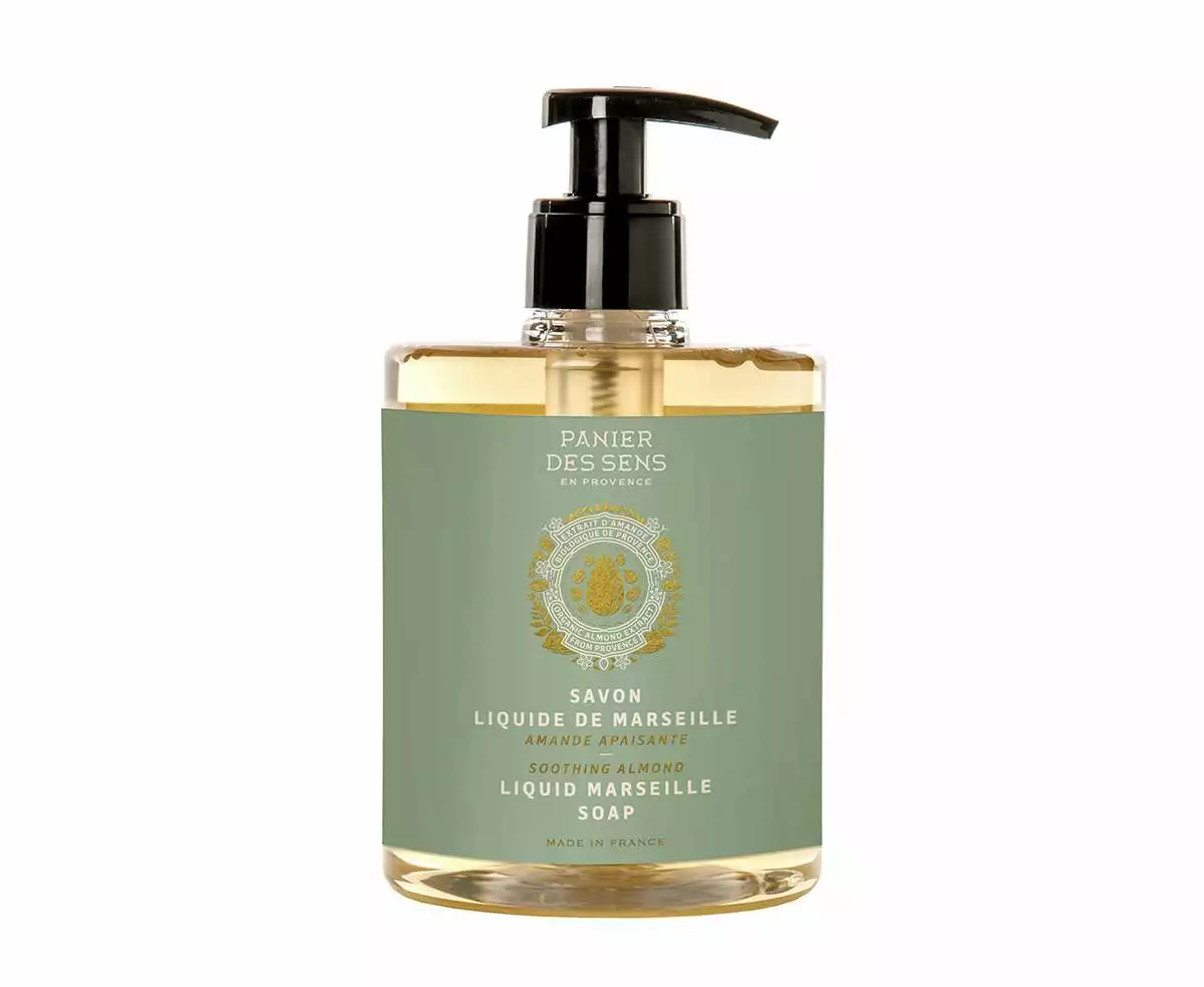 FLYTENDE MARSEILLE SÅPE med beroligende mandelekstrakt. Med 100% vegetabilske oljer. Tørker ikke ut huden, og kan brukes over hele kroppen
