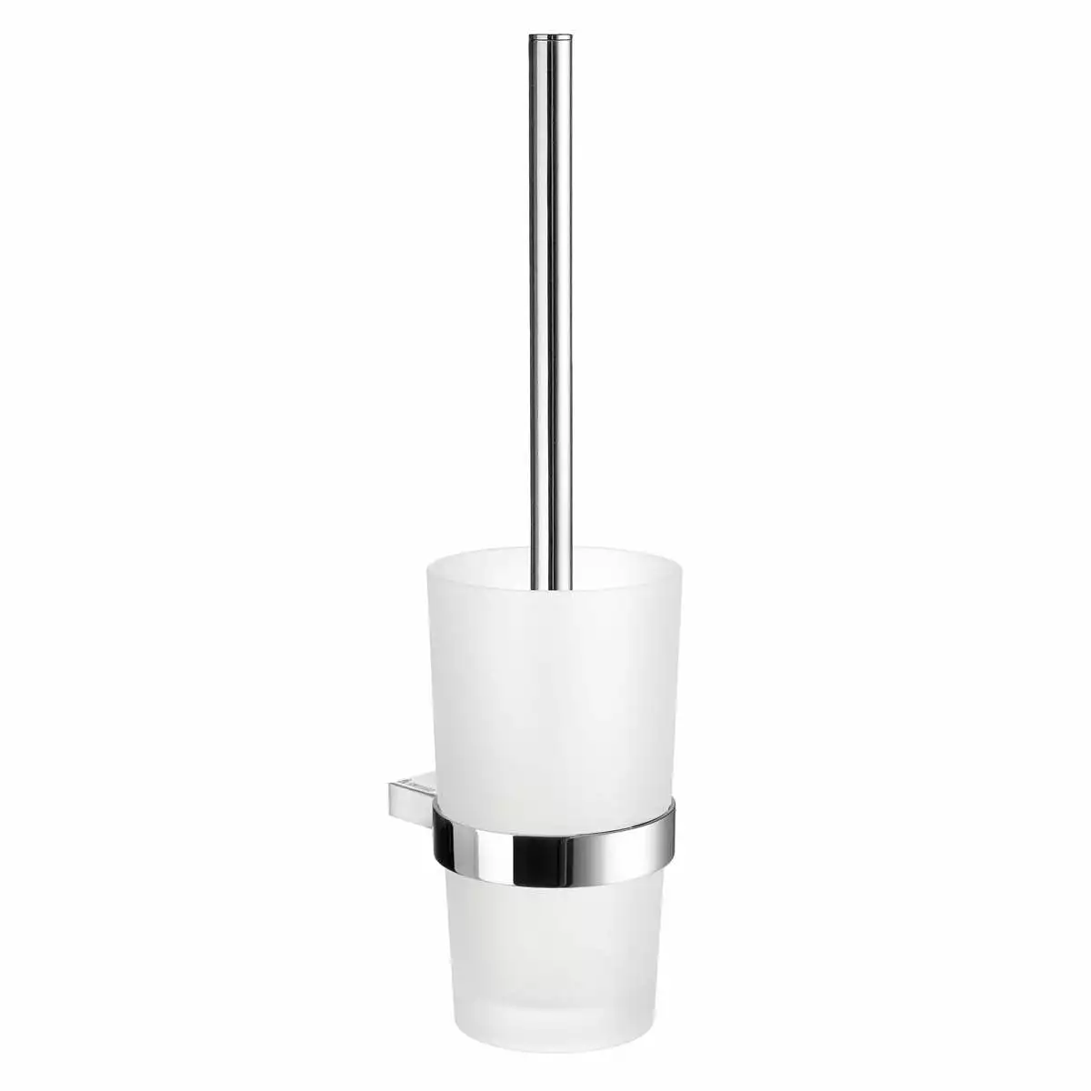 Toalettbørste for veggmontering. Holder i polert krom med beholder i frostet glass.