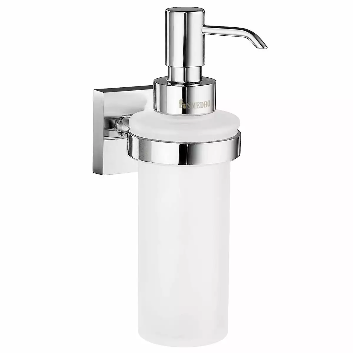 Såpedispenser i frostet glass. Monteres på vegg ved hjelp av lim og skruer. Skjult innfestning.