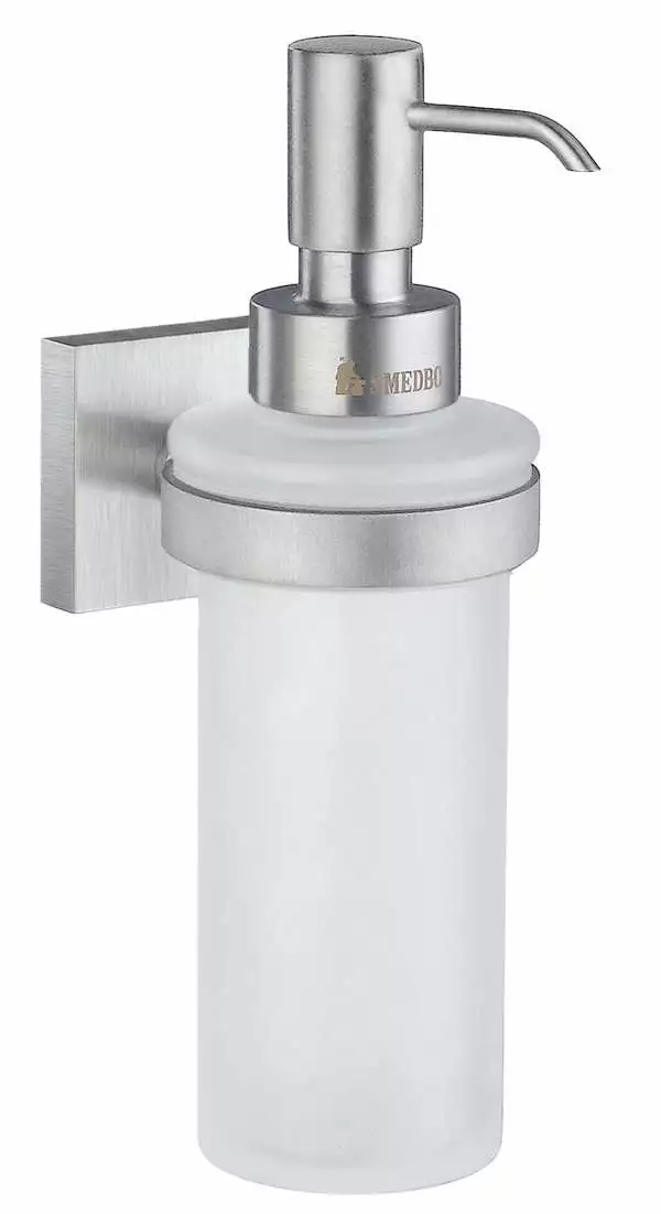 Såpedispenser i frostet glass. Monteres på vegg ved hjelp av lim og skruer. Skjult innfestning.