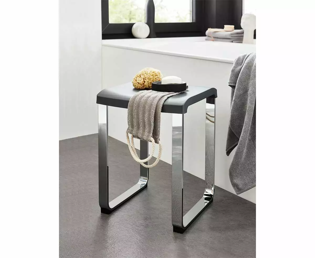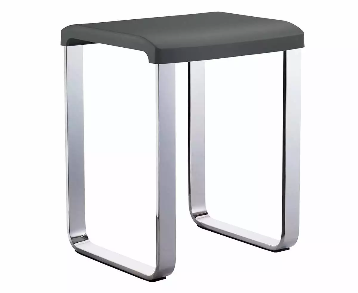 Baderomskrakk i forkrommet aluminium med grått sete. Med gummiknotter for god stabilitet. Krakken kan også brukes i dusjen.