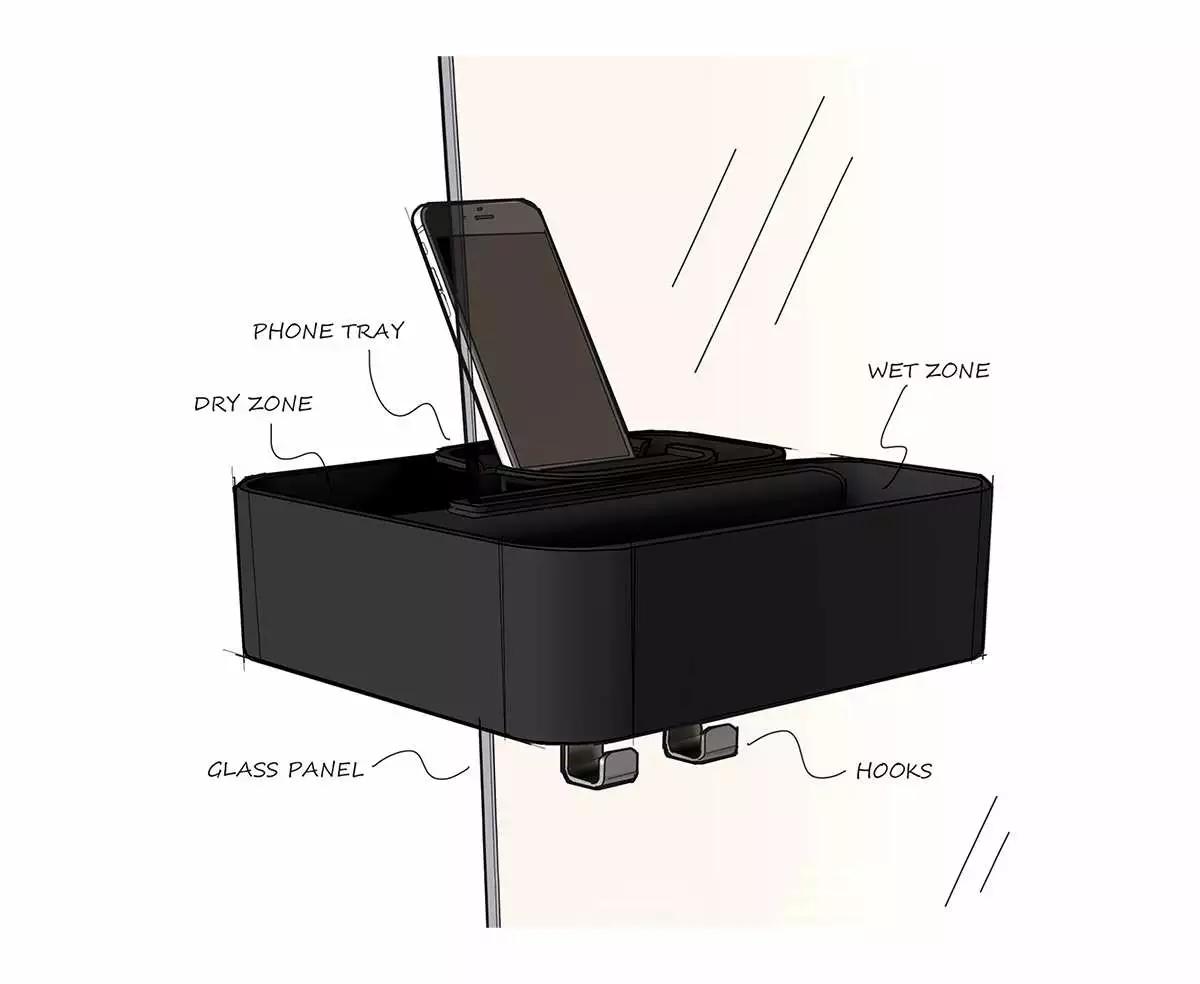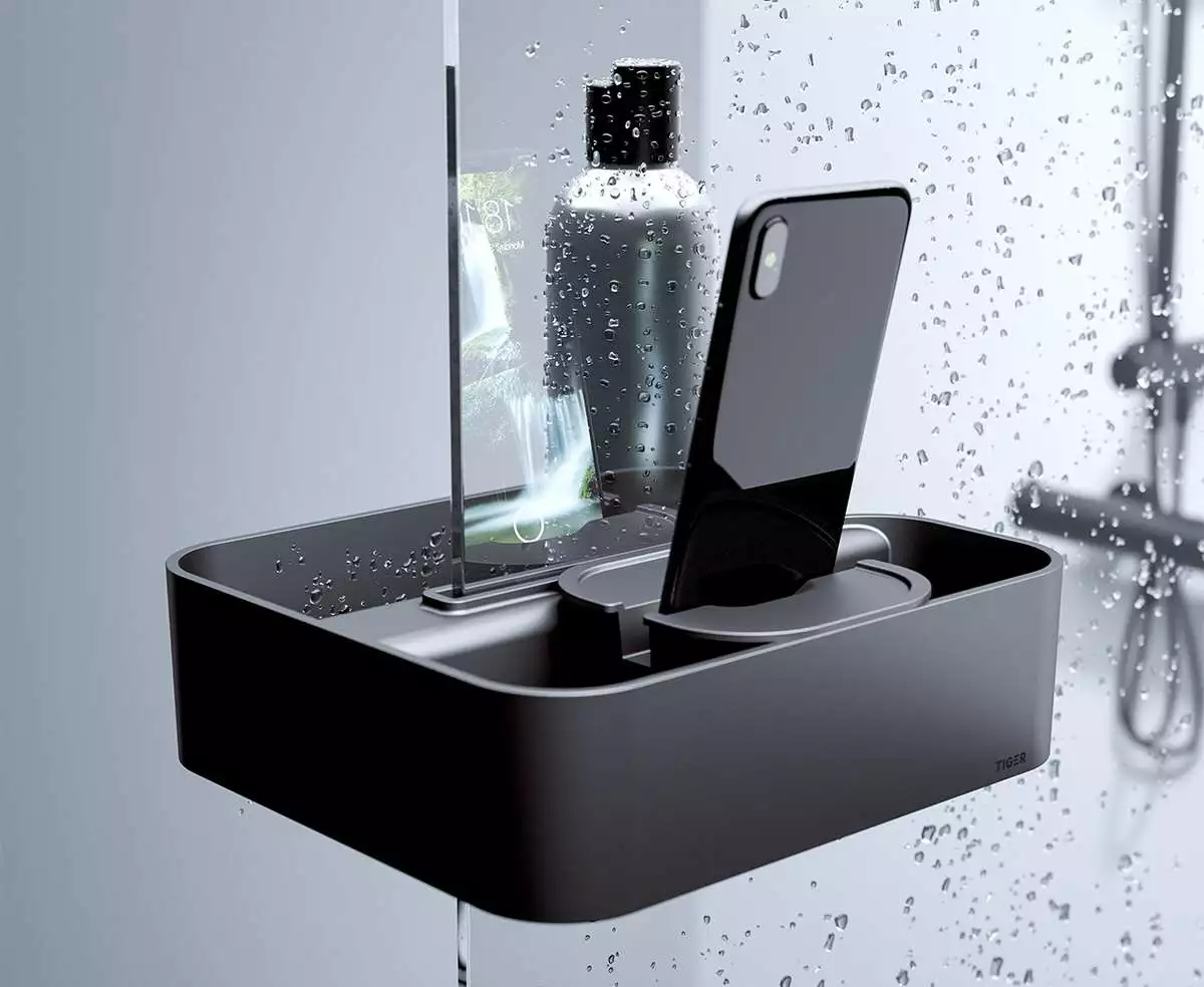 - Oppbevaringsplass for flasker og sjampo i den våte delen, mens håndkle, klokke og telefon har et trygt sted på den tørre siden av dusjveggen