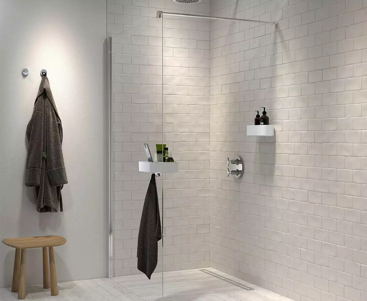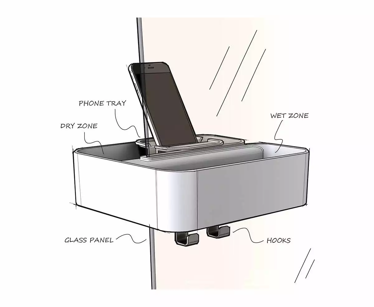 - Oppbevaringsplass for flasker og sjampo i den våte delen, mens håndkle, klokke og telefon har et trygt sted på den tørre siden av dusjveggen
