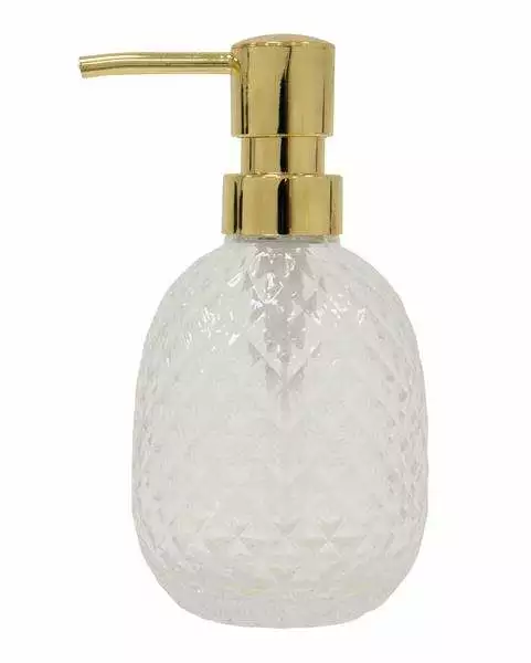Såpedispenser i glass og gullfarget metall. Delikat tilbehørsserie i diamantmønstret glass i kombinasjon med sølv- eller gullfarget metall.